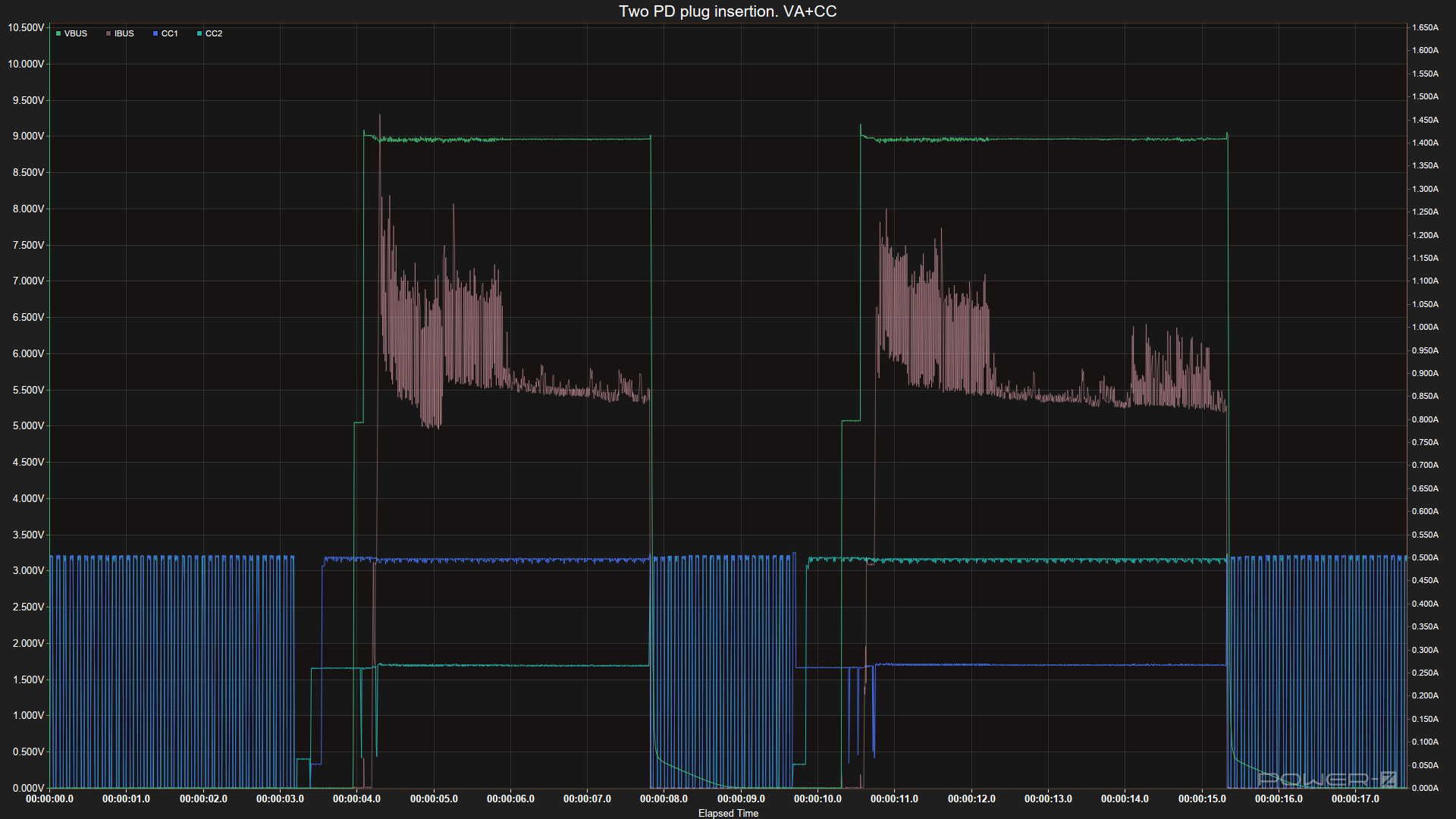 Видите отличия? Из-за меньшего числа точек мониторинг в неподключенном состоянии схлопнулся до острых пиков. Второй отличие уже в характере подключения: на VBUS и VCONN напряжение подаётся одновременно, так что нужно всегда понимать, что подача двух напряжений асинхронна и независима.