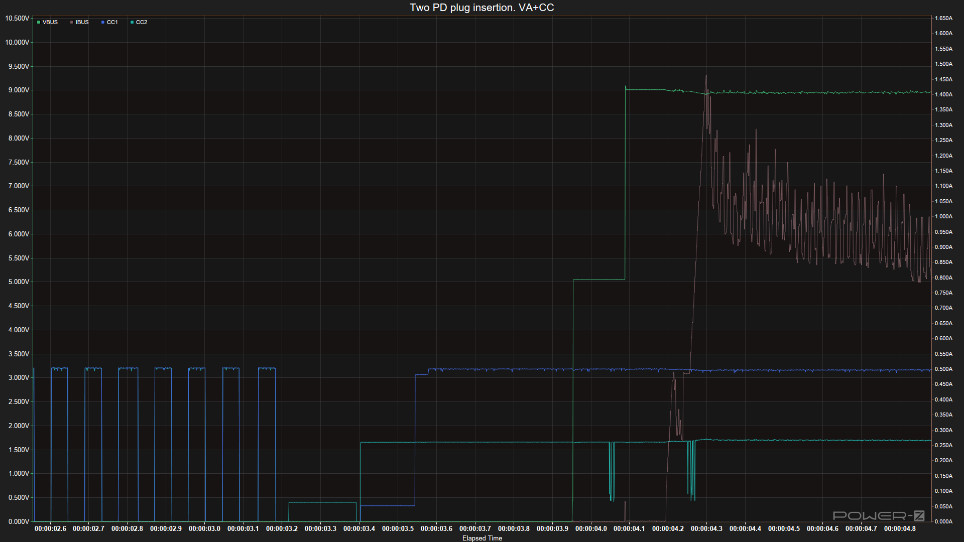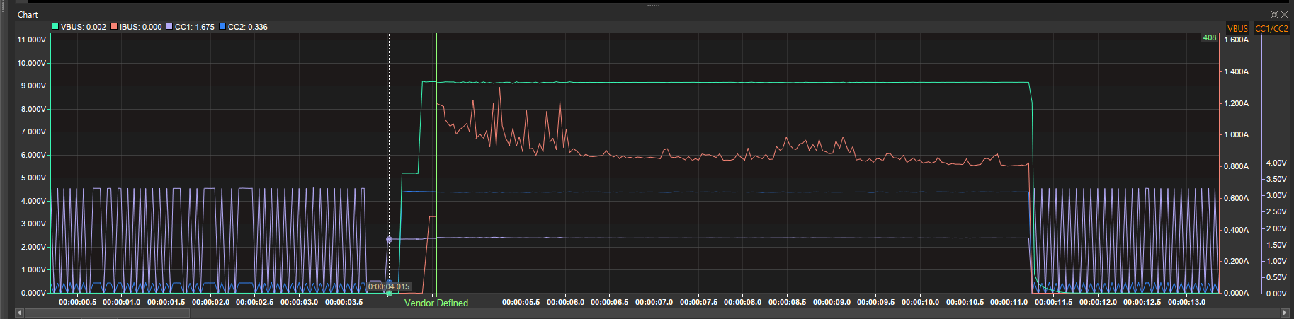 И последние интересные точки на графике - это общение по протоколу Power Delivery для переключения VBUS на 9V. Колебания на линии CC (CC2) незадолго до поднятия напряжения - это и есть взаимодействие PD.