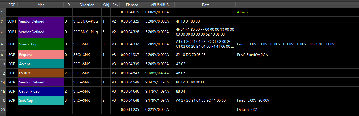 Протокол PD включается не сразу, в стандарте заданы таймауты после выставления напряжения на VBUS и VCONN. А вот сами транзакции на шине происходят довольно оперативно. Первый блок обмена данными - это сообщения 2-12, сразу перед повышением напряжения до 9V. Там всё просто: