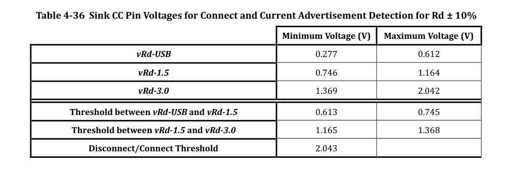 Вторая таблица - это диапазоны напряжений и их интерпретация sinkом (если вдруг ему важен ток, который может дать источник на 5V). Поскольку сопротивление кабеля ничтожно по сравнению с резисторами Rd и Rp, то эти диапазоны применимы к двум сторонам кабеля.